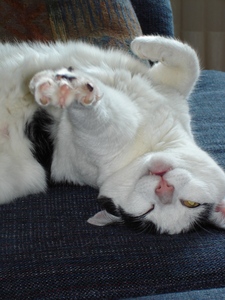 One of the most beautiful things I remember about you is your wonderful raising of-the left- paw like a Japanese cat! I would say something to you, something affectionate, often asking you if you were the most beautiful “mostly white” girl in the house, and you would raise your paw in the air! You often liked to go up on the windowsill in the sunroom to feel the strings of the Venetian blinds on your whiskers, and when you were there and I was sitting in the chair by the windowsill, you would raise your paw in a loving gesture! It was one of your most endearing acts, and now that your body is gone, our lives are the poorer for not being able to see you doing that any more.